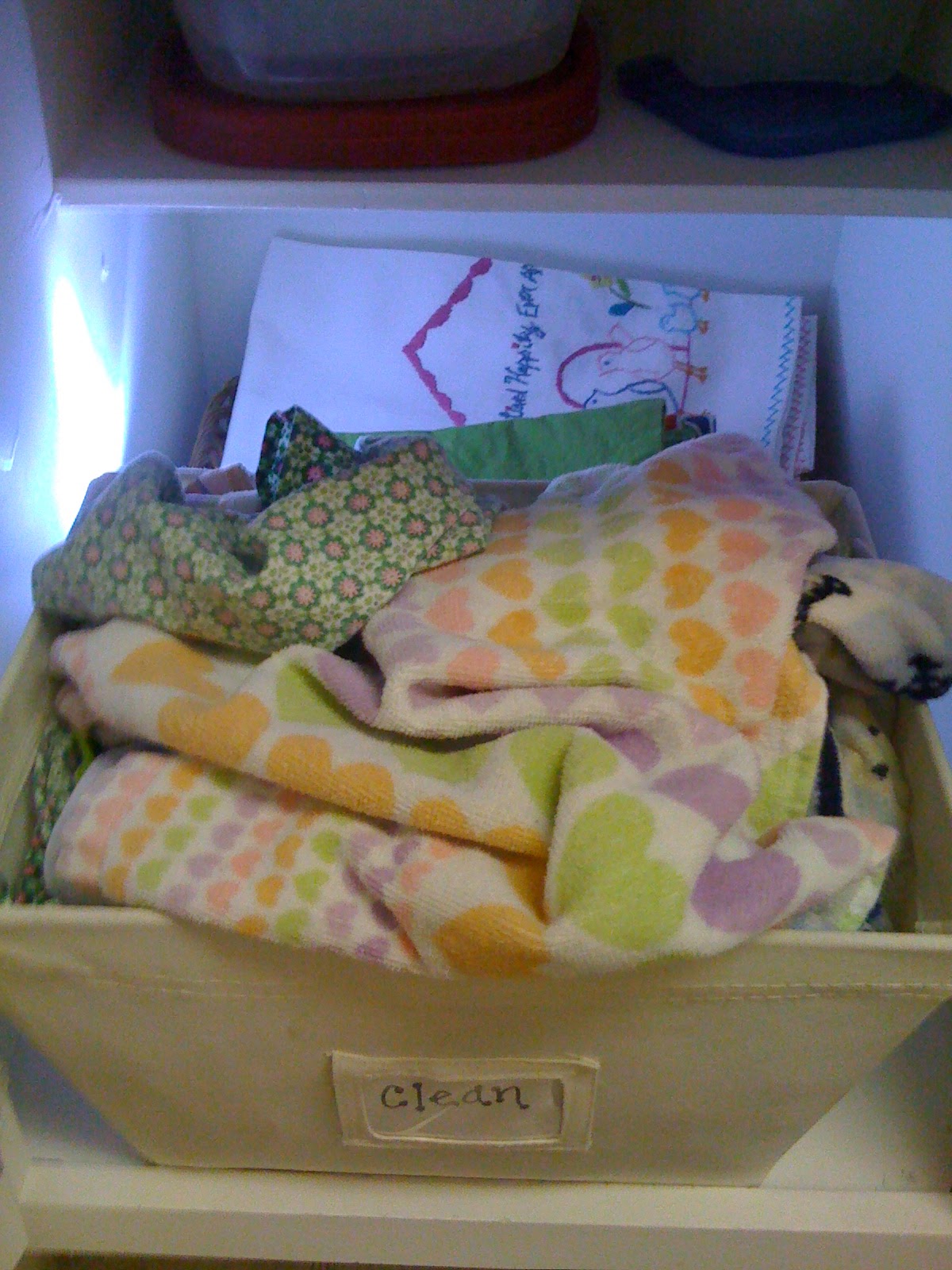 So on Friday night, after years of keeping a stray dish towel dangling off of the oven door handle, I made the full paper-to-cloth switch. I bought $10 worth (meaning, a lot) of old dish towels and cloth napkins from Goodwill to supplement my current stash. I reorganized my cabinet space and two of my storage bins - one for clean towels and one for dirty - and dusted off my crab-shaped napkin holder (which we fondly named “Crabkin”). Finally, I put away my paper towels and their little upside-down-T-shaped holder away in a hard-to-reach cupboard, intending to use them for emergency “biomaterial” spills only.